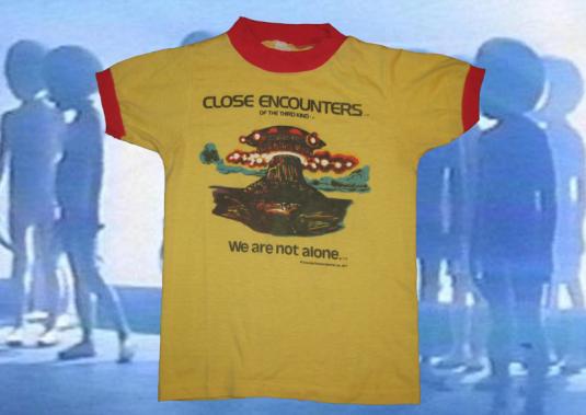 Fun (?) fact: The cast and crew of Close Encounters of the Third Kind were all lame. The little kid in the movie, Cary Guffey, was really good at nailing his scene so Spielberg had shirts printed that said ‘One-Take Cary’. In another highly hilarious t-shirt creating story, actor François Truffaut said his line ‘they belong here more than we’, but the crew heard it as ‘Zey belong here, Mozambique’ so of course they had to commemorate it somehow. I just imagine a whole bunch of lame dads running around the set yelling, ‘that’s hilarious! Put it on a t-shirt!’ and then laughing uproariously.