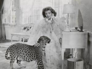 But I still loved it. The main draw for me is the attraction Cary Grant and Katherine Hepburn had. They were perfect to play opposite each other. Grant was a seasoned Vaudeville actor so slapstick comedy was nothing new for him, but Hepburn had never done anything quite like this. I think what makes her so successful is that she truly enjoyed herself. You can see how much fun she is having causing all this trouble and seems perfectly at ease in front of the camera. It’s hard not to fall in love with her. I enjoyed all of the acting, really, because in this movie, there was no such thing as over the top. And of course the leopard was just icing on the cake. I was worried he would be used to do tricks and would be seen throughout the whole film, but that wasn’t the case. He’s integral to the plot but he really isn’t shown all that much.